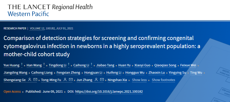 近日,实验室在国际著名医学杂志《柳叶刀》子刊《柳叶刀-区域健康(西太平洋)》(The Lancet Regional Health-Western Pacific)在线发表了题为“高血清流行人群新生儿先天性巨细胞病毒感染筛查策略对比:一项母婴队列研究”(Comparison of detection strategies for screening and confirming congenital cytomegalovirus infection in newborns in a highly seroprevalent population: a mother-child cohort study)的最新研究成果。该研究通过多中心母婴队列观察,系统对比了基于新生儿唾液和尿液标本进行先天性巨细胞病毒感染筛查的多种策略,提出了初次筛查和再次确认检测的最优样本采集时间窗口和样本类型,对包括中国以及大多数发展中国家在内的广大巨细胞病毒感染高流行区的先天性巨细胞病毒感染防控工作具有重要指导意义。