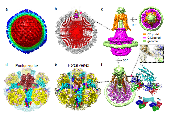 2022年3月22日,实验室在《自然》子刊《自然•通讯》(Nature Communications)上发表题为“Structures of pseudorabies virus capsids”的研究论文。该论文首次揭示了疱疹病毒科α家族的伪狂犬病毒(pseudorabies virus, PRV)不同类型核衣壳的近原子分辨率结构,以及衣壳相关皮层蛋白复合体(capsid-associated tegument complex, CATC)、基因组进出门户蛋白复合体(portal complex)的原位结构,阐明了PRV衣壳装配以及病毒基因组包装、稳定和释放机制,为PRV抗病毒药物和PRV作为溶瘤病毒药物的研究提供重要信息支持。