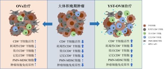 在该研究中,研究人员首先证实了溶瘤病毒OVH是理想的PD-1抗体增效剂,二者联合能够弥补PD-1抗体客观响应率不足的短板,有效治愈大体积晚期肿瘤。以此为基础进一步构建出携带人源化hPD-1scFv的溶瘤病毒YST-OVH,并应用多种体内外溶瘤病毒杀伤与治疗模型(包括人类与小鼠20种不同类型的肿瘤以及正常细胞体外模型、免疫健全小鼠皮下移植肿瘤模型、免疫缺陷小鼠异种移植肿瘤模型、PD-1人源化小鼠肝脏原位肿瘤和皮下移植肿瘤模型),证实YST-OVH能够选择性感染杀伤肿瘤细胞,在肿瘤内部大量表达分泌hPD-1scFv并释放到血液循环中,从而实现溶瘤病毒与PD-1抗体的联合治疗。YST-OVH治疗能够诱导机体产生长效特异性抗肿瘤免疫反应,在大体积晚期肿瘤的治疗中取得远超溶瘤病毒OVH或PD-1抗体单独治疗的疗效,不仅能够有效治愈大体积晚期肿瘤,延长荷瘤小鼠生存期,还能够通过形成免疫记忆来防止肿瘤复发。