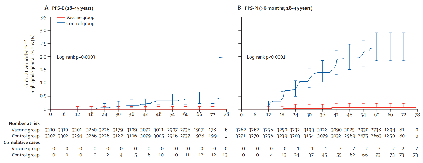 对于馨可宁®III期临床试验66个月随访的终期分析结果显示,在符合方案集(PPS)人群中,该疫苗对HPV 16型和/或18型感染相关的病变终点(CIN2+和/或VIN2+和/或VaIN2+)的保护率为100.0%(95%置信区间:67.2%-100.0%),在18-26岁和27-45岁年龄组间保护效力分别为100.0%(95%置信区间:40.6%-100.0%)和100.0%(95%置信区间:-7.7%-100.0%)。对HPV 16型和/或18型持续性感染(6月以上)的保护率为97.3%(95%置信区间:89.9%-99.7%),在18-26岁和27-45岁年龄组间保护效力分别为93.9%(95%置信区间:76.3%-99.3%)和100.0%(95%置信区间:90.6%-100.0%)。该疫苗安全性良好,在整个研究期间未发生与疫苗接种相关的严重不良事件,未发生与疫苗接种相关的妊娠结局和新生儿健康状况的异常。该疫苗可有效诱导受试者产生较高水平的HPV 16型和18型中和抗体和IgG抗体并持续至少66个月。该研究结果证实馨可宁®在27-45岁及18-26岁易感女性人群中均具有优异的有效性以及良好的安全性,可有效地预防HPV 16型和/或18型相关的宫颈高度癌前病变及持续性感染。