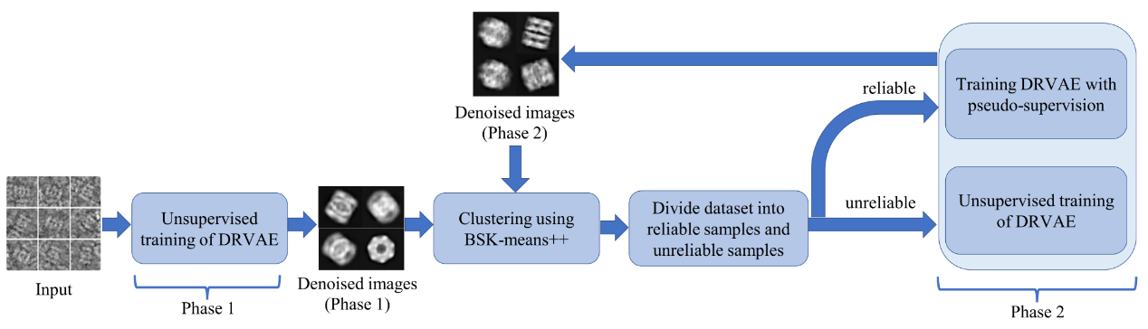 该研究主要有三个创新点:(1)设计了DRVAE深度学习模型用于冷冻电镜颗粒图像的降噪;(2)采用了二段式训练策略,提高降噪和细节恢复能力;(3)设计了BSK-means++算法,并使用环形特征,提高了类平均图丰富度,减少了类崩塌现象。在三套仿真数据集以及两套真实拍摄的数据集上进行聚类精度对比,DRVAE with BSK-means++整体上取得了优秀的聚类精确度。