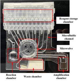 该微流控芯片大小仅为115×80×10mm,近似成年人手掌大小。按照核酸检测流程,其集成了储液腔、微阀、反应腔、扩增腔、废液腔和多达14条流道。研究人员针对前述功能模块分别进行结构设计、功能实现和性能测试,并对芯片的实际检测功能进行探究。通过对先进热封技术的突破,实现了核酸检测试剂在储液腔的预存储,为现场快速检测奠定了基础。微阀用于液流控制,同时还具有液流流经过程的密封功能。研究人员搭建了测试平台,分别对微阀动、静密封性能进行探究。结果表明,在考虑注塑误差的情况下,微阀压紧0.2mm即可承受高达250kPa气压,远大于检测过程中需承受的气压强度。随后,通过使用电机模拟转阀18min,识别出试剂液面最大变化仅为0.402mm,证明了微阀同样具有良好的动密封性能。反应腔是核酸提取各个生化反应的腔室,研究人员根据其与超声耦合工作的需求,将其设计为特殊球冠状结构。通过超高速工业相机拍摄超声辅助磁珠混匀过程,结合ImageJ软件进行图像分析,发现目前结构下的磁珠在腔室内的分布可以在三秒内由5.4%增加到95.3%,没有出现明显的磁珠聚团现象。扩增腔采用薄片状设计,配合仪器中帕尔贴双面夹紧的热源结构,最大程度增加与热源的相对接触面积,提升温度变化速率,实现最快可在20min内完成45个扩增所需的温度循环,相比传统商用PCR仪长达2小时的耗时,检测时间大大缩短。最后,以人血清为样本,HCMV为检测对象,对芯片的核酸检测性能进行了实验评估。分别对比了三个样本浓度梯度的提取和快速扩增效果,实验结果表明,芯片提取的稳定性优于手工提取,芯片扩增具有与伯乐PCR仪同一水平的线性度。另外,实验验证了芯片对HCMV的全流程检测效果,其检测下限可低至1 copies/μL,且对于28-36Ct浓度范围的HCMV样本均能快速准确获得定量检测结果。