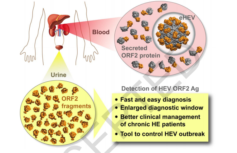 2022年9月15日,研究团队在Hepatology发表题为“Urine is a viral antigen reservoir in hepatitis E virus infection”的文章。该研究发现戊型肝炎患者血液中存在的大量HEV抗原会特异性聚集到肾脏,并在患者尿液中形成富集,其抗原水平是血液中含量的10倍,这意味尿液抗原比血液中的检出时间更早,操作更方便。研究团队还首次揭示了尿液HEV抗原的主要存在形式及代谢来源。