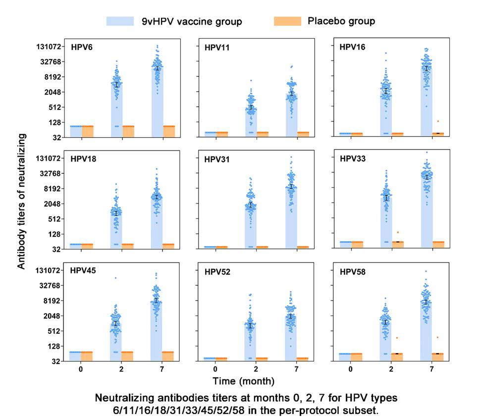 为了进一步探究该疫苗在更大规模健康女性人群中的免疫原性和安全性,研究团队于2019年在江苏省东台市开展了一项随机、双盲、空白佐剂(安慰剂)对照的II期临床试验。研究共入组627名18-45岁健康女性志愿者,1:1随机分配至九价疫苗组或安慰剂对照组,并按照0天、1个月、6个月三剂次免疫程序接种九价疫苗或空白佐剂对照,随访接种后的各种不良事件并采集系列血清检测针对9个型别HPV的抗体阳转率和抗体水平。结果显示,所有按程序完成九价疫苗免疫的志愿者中均在末次接种后1个月检出了针对九个HPV型别的血清中和抗体和/或IgG抗体阳转。九价疫苗组和对照组的总体不良事件(无论是否与疫苗相关)相近,绝大多数不良事件症状轻微并很快恢复,未发生与该疫苗相关的严重不良事件,表明该疫苗安全性良好。该研究证实了国产HPV九价疫苗馨可宁®9在我国18-45岁健康女性中的免疫原性和安全性,为该疫苗的后续保护效力研究以及注册上市奠定了坚实基础。