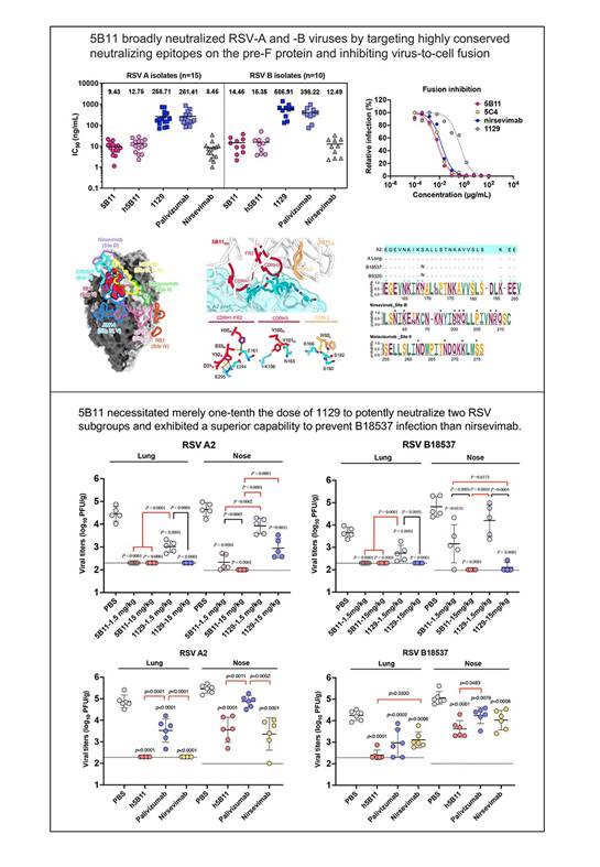 针对上述需求,实验室研究团队首先通过核酸和腺病毒复合免疫方法免疫小鼠,筛选到1株RSV融合前构象F蛋白(pre-F)特异性的广谱高效中和抗体5B11。该分子及其人源化抗体h5B11均能广谱高效中和RSV A和B型实验株和临床株,中和活性比1129(Palivizumab鼠源前体)高约20倍以上,对B18537毒株的中和能力比Nirsevimab高约3倍。冷冻电镜解析和体外逃逸突变筛选实验表明5B11通过靶向site V内高度保守和免疫耐受表位,优于Nirsevimab识别的site Ø表位。体内预防实验表明5B11只需1129的1/10剂量就能够有效预防RSV感染,并且在预防B18537毒株感染方面,h5B11的抗病毒作用优于Nirsevimab。体内治疗实验表明,高剂量(15 mg/kg)5B11可以有效抑制上下呼吸道道病毒的复制,缓解肺部炎症,展示了其开发为治疗药物的潜力。此外,本研究还发现亲和力成熟后的Nirsevimab虽然弥补了其亲本抗体D25中和部分B型毒株(如B18537)的不足,但体内抗病毒作用并未提高,Motavizumab(Palivizumab的二代抗体)也表现了同样的现象,提示抗体的亲和力成熟可以提高其中和效价,但未必能够改善其体内的保护作用。综上,本研究开发了一株靶向pre-F蛋白上更为保守表位的广谱高效中和抗体,为预防婴幼儿RSV感染提供了一种新的候选药物。