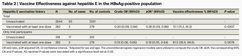 2007年8月~2017年10月期间,研究团队在江苏省东台市11个乡镇开展了益可宁®III期临床试验及并进行了持续10年的长期随访,所建立的急性肝炎监测系统覆盖11个乡镇近29万名目标年龄的居住人口。10年肝炎监测期间累计记录了313 536例疑似肝炎病例(乏力纳差≥3天),其中12 787例丙氨酸氨基转移酶(ALT)≥2.5倍正常值上限(ULN)并且有12 707例完成了初步肝炎分型检测。基于肝炎分型检测中发现的2 926例HBsAg阳性且出生于1941~1991年间(III期临床试验入选年龄)疑似肝炎病例,该研究采用检测阴性设计,主要目的为评价戊肝疫苗在HBsAg阳性人群中的保护效果。在经过年龄和性别校正后,分析结果显示接种至少一剂益可宁®的有效性为72.1%(95% CI 11.2~91.2);当分析人群仅限于III期临床试验的参与者时,有效性则达到81.5%(95% CI 35.9~94.6)。该结果表明益可宁®能为HBsAg阳性人群提供持久且有效的戊肝防护。